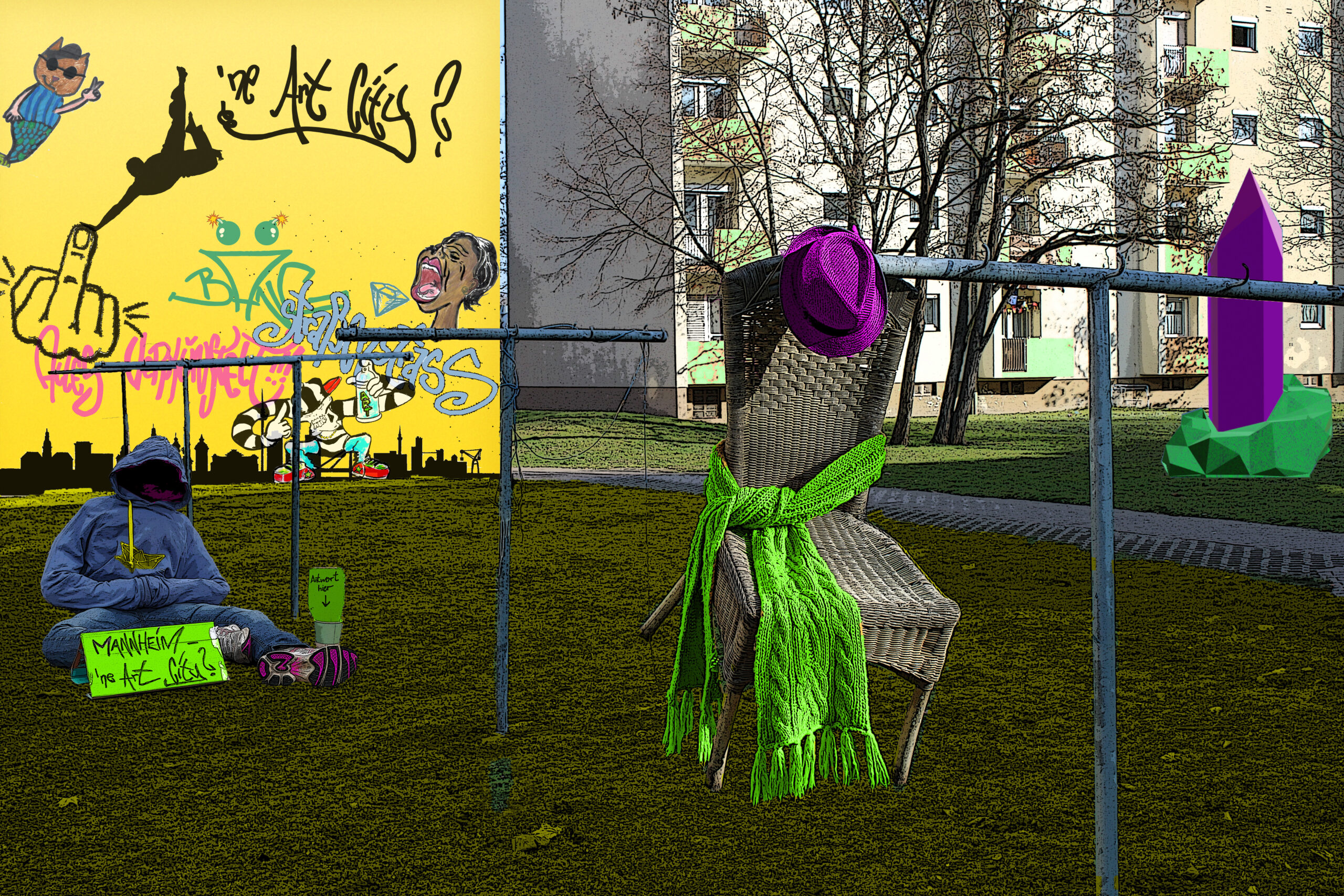 Wie wird es werden, wenn eine abgestempelte Hochhaussiedlung ihr soziales Geflecht durch die Lüfte spannt, wenn Jugendliche ihre Gedanken über unsere zunehmend kriegerische Welt in Kunstwerken teilen? Was könnte passieren, wenn ein ganzer Stadtteil die kreative Verantwortung für den zentralen Platz übernimmt, wenn 7 verschiedene künstlerische Ausdrucksweisen einen eigenen Kosmos unserer Obektgesellschaft erschaffen?